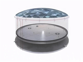 全接液內浮盤指內浮盤本體漂浮在液體中有一定的浸液高度,浮力單元之間及與各部件的連接部位有可靠的密封措施,形成底部全域浸入液體的內浮盤。全浸液內浮盤包括箱體式、浮艙式、玻璃鋼復合材料式、全焊接蜂巢芯式及其他形式的裝配式全浸液內浮頂。全接液內浮盤適用于儲罐內直徑5m~48m。